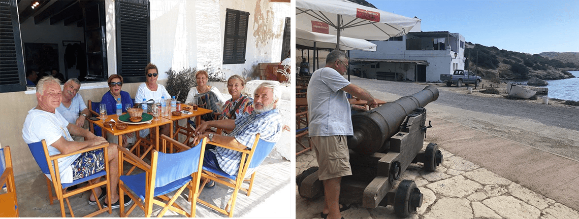 Koyun iskeleye yakın kısmında yeşil şamandıralar, günübirlik gelenler için ve ücretsiz, ama en geç saat 17’de boşaltmak gerekiyor. Onun dışında teknelerin boyuna göre renkleri farklı ve ücretli, geceleme için kullanılabilecek şamandıralar koya yayılmış durumda. Puerto de Cabrera’da yeşil şamandıralardan birine bağlandık ve 3 ayrı seferde mürettebat, botla kıyıya ayak bastı. Ben ve Nilgün ile Murat ve Fuat Kaptanlar yürüyerek kaleye tırmanıyoruz, diğerlerimiz iskelede Cantina isimli restoran-barda kalıyorlar.